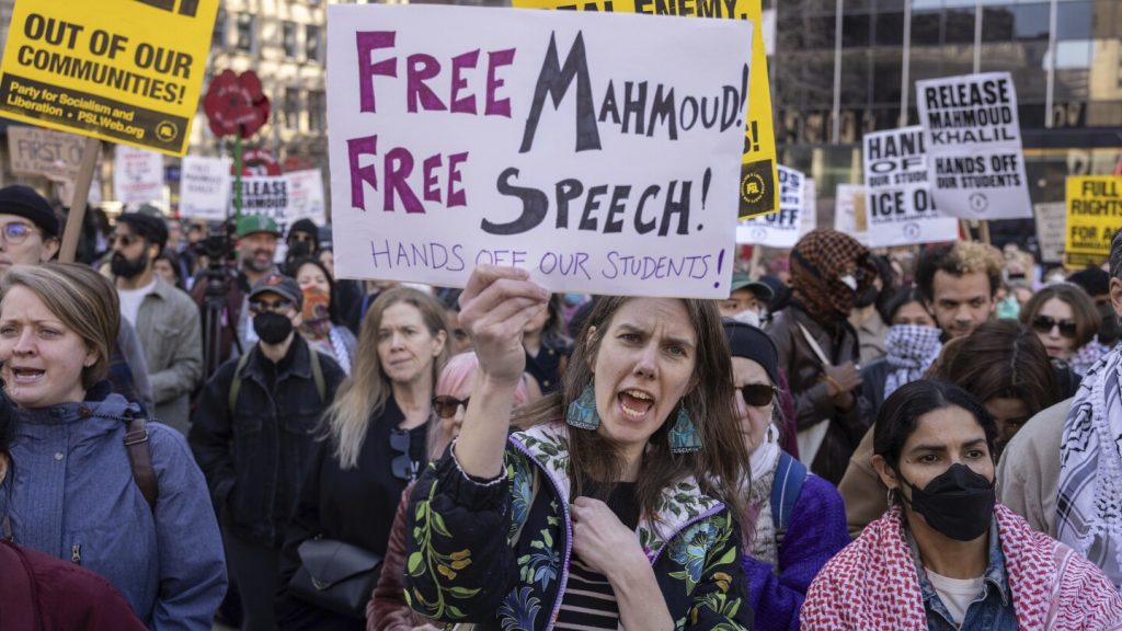 A protester chants during a demonstration in support of Palestinian activist Mahmoud Khalil, Monday, March 10, 2025, in New York. (AP Photo/Yuki Iwamura)
